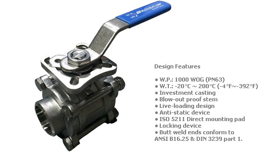 ALFA HI-FLOW® 3-PC ball valve in full bore, floating ball, butt weld connection, pressure rating 1000 psi-g WOG, antistatic design, acc. To ATEX guidance 94/9/EC, blow-out proof stem and ISO 5211 “Direct Mount” top flange. Actuated by means of a lockable lever or T-bar with PVC sleeve.